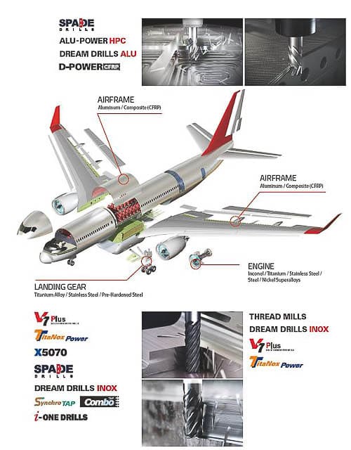 อุตสาหกรรมการบินและอวกาศใช้วัสดุที่มีความแข็งแรงสูงเช่น อลูมิเนียมอัลลอย,ไทเทเนียมอัลลอยและ CFRP ทำให้ผลิตภัณฑ์มีน้ำหนักเบาและเพิ่มประสิทธิภาพเครื่องยนต์ เนื่องจากวัสดุเหล่านี้มีความยากในการตัดเฉือน เครื่องมือตัดและวิธีการตัดเฉือนจึงมีความสำคัญอย่างมาก